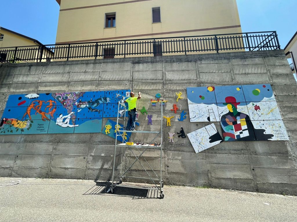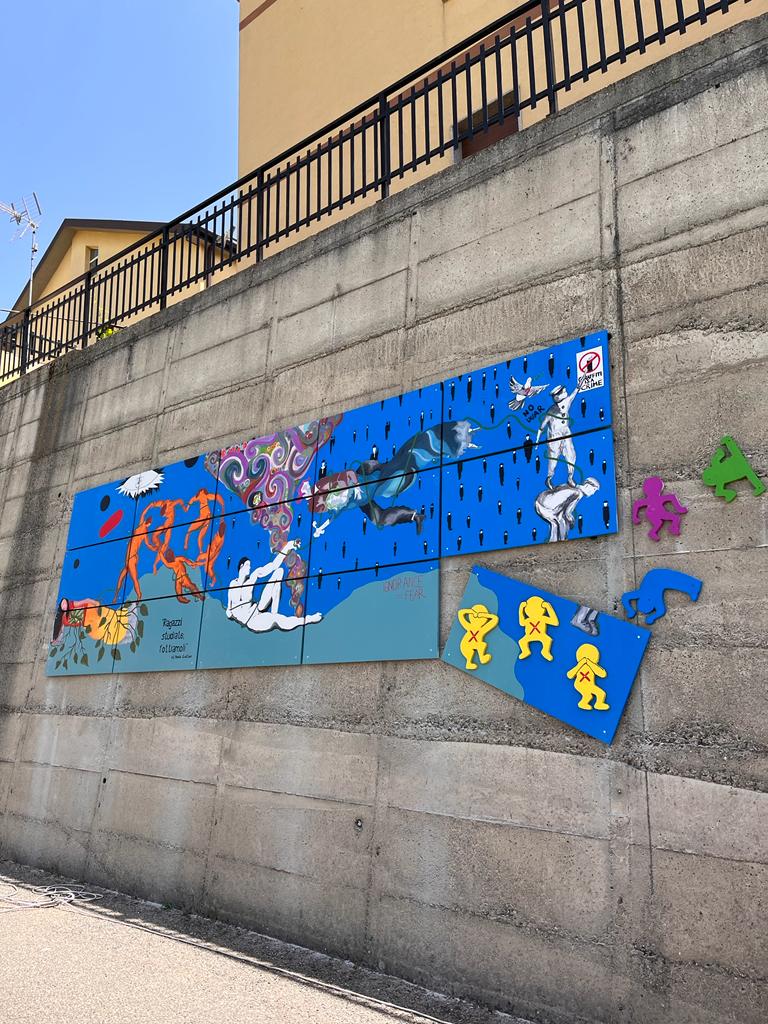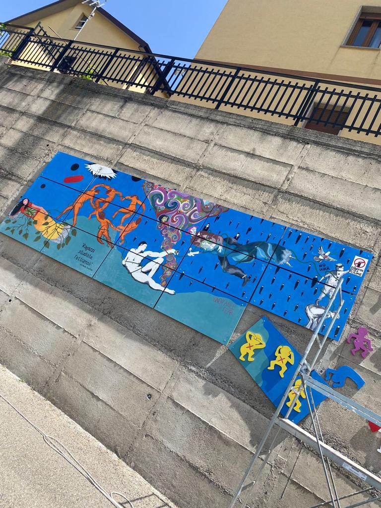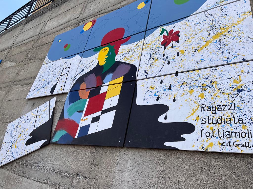 L’opera che sovrasta l’ingresso dell’edificio scolastico è potente e impattante, non solo per l’effetto cromatico che giganteggia sulla superficie muraria, ampia e considerevole, ma perché sembra ricomporre l’individuazione di diversi segni artistici, in grado di sublimare significazione e comunicazione artistica.