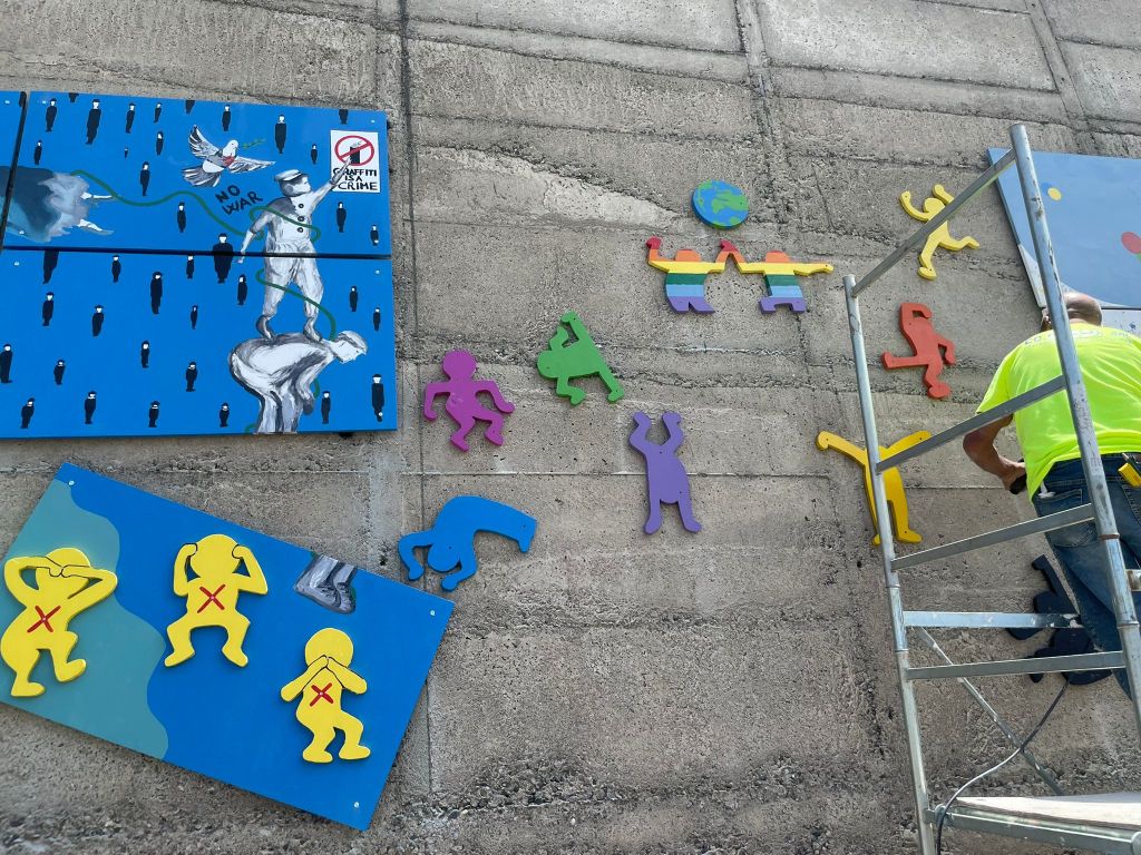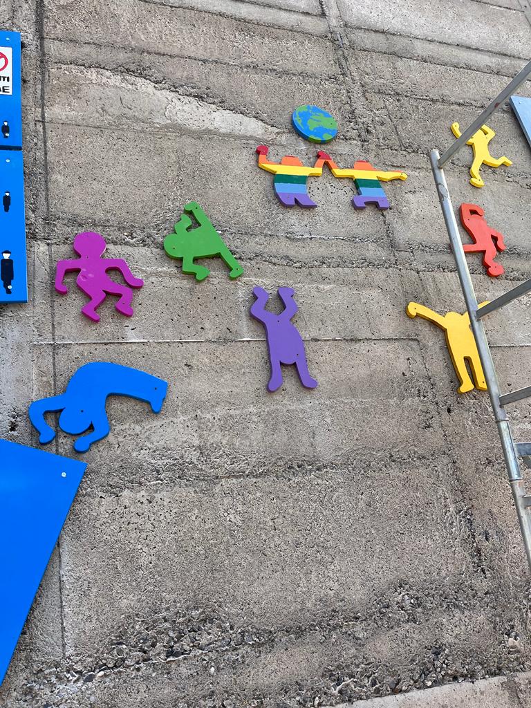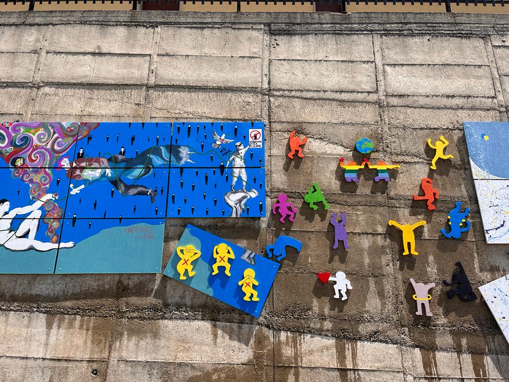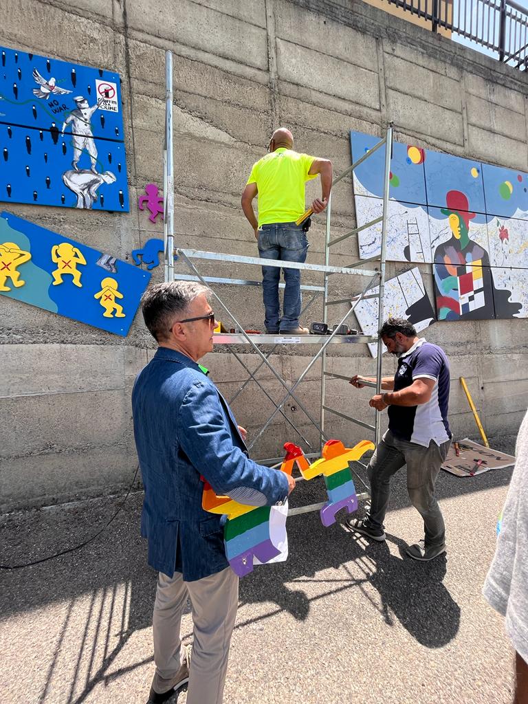 L’opera che sovrasta l’ingresso dell’edificio scolastico è potente e impattante, non solo per l’effetto cromatico che giganteggia sulla superficie muraria, ampia e considerevole, ma perché sembra ricomporre l’individuazione di diversi segni artistici, in grado di sublimare significazione e comunicazione artistica.